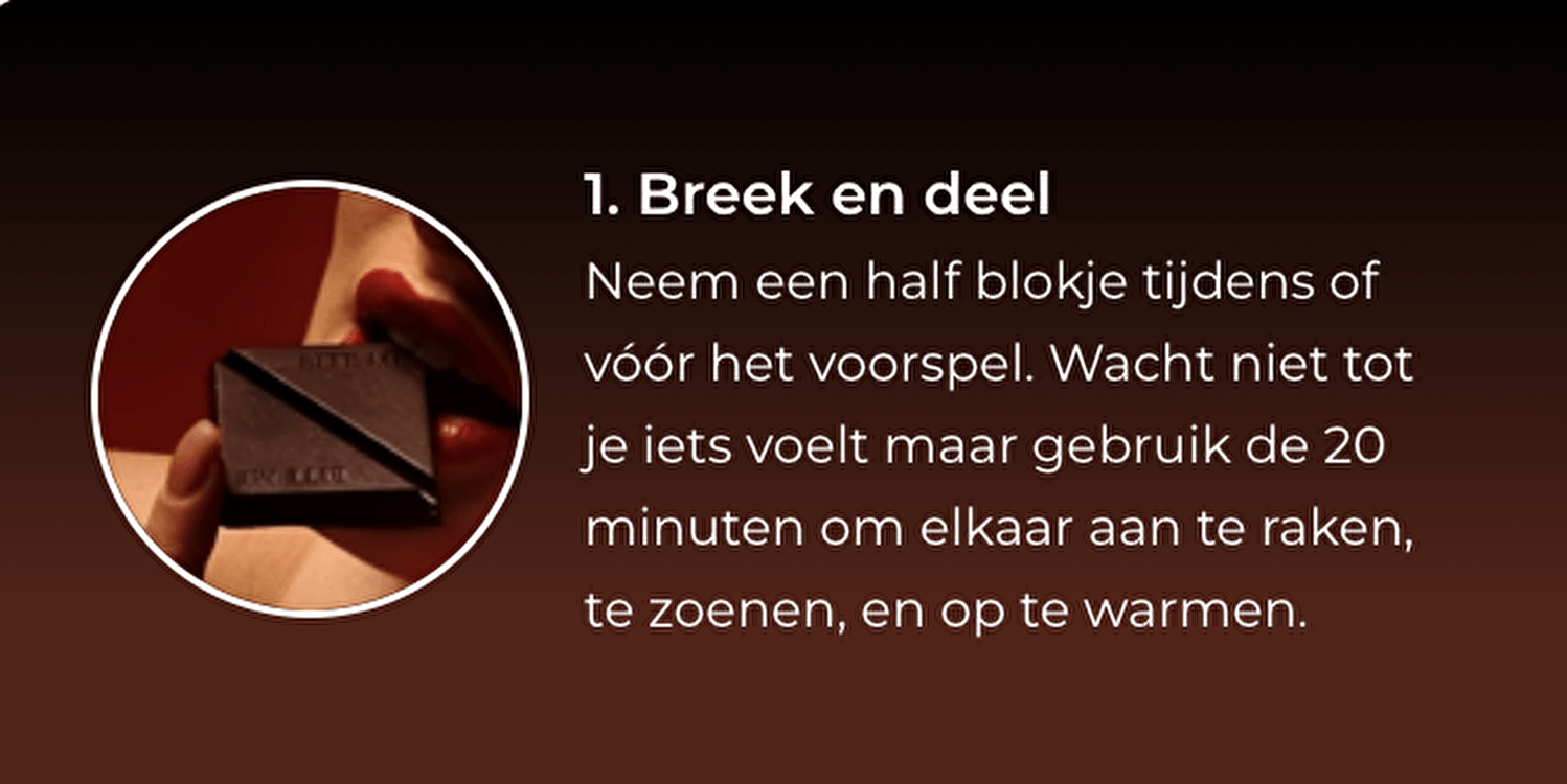 Kom in de stemming; Laat de spanning opbouwen terwijl de natuurlijke ingrediënten gaan werken. Na ongeveer 20 minuten werkt Sense Chocolate optimaal, ga er dan ook helemaal voor.